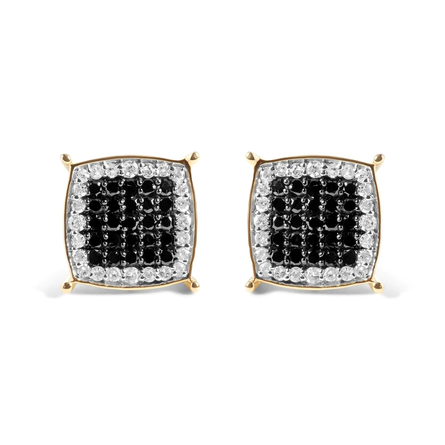 Introduce sophistication and elegance to your everyday style with these stunning men's earrings. Crafted from 10K yellow gold, these earrings feature a captivating combination of black and white treated diamonds that will leave you mesmerized. With a total of 98 diamonds, these earrings boast 50 black color treated diamonds and 48 white diamonds for a total weight of 1/2 carat. The diamonds are of I-J color and I2-I3 clarity, and are set in a prong setting for maximum sparkle. The earring finding is a screw on for a secure fit. These earrings are perfect for any occasion and make for a great gift for any man in your life. Add a touch of luxury to your everyday look with these mesmerizing black and white diamond stud earrings.